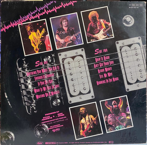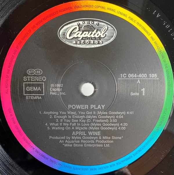 Power Play is the tenth studio album by the Canadian rock band April Wine, released in 1982. Similar to April Wine [r2723437 and [r16504701 but those are Purple & Maroon Capitol Labels, this being the retro Black with Rainbow circle most likely a 1983 or later Reissue. Made in EEC see EMI Country Codes against Catalog Suffix 1C = Germany [l26126 Catalog # 1C 064-400 105 On Spine and rear of Jacket, Top Right Hand Corner and Labels. logo for Cassette and 264-400 105 under catalog number. Released with inner photo/credit sleeve. has 400105 on one side Top Right Hand Corner. Embossed EMI logo on back of jacket, Bottom Right Hand Corner On back of jacket: Capitol Records Logo followed by EMI ELECTROLA "EMI Electrola GMBH · All rights reserved. Printed in Germany by 4P NICOLAUS GMBH, Köln" EMI ® Recorded at Le Studio, Morin Heights, Quebec, Canada. Mixed at Fantasy Studios, Berkeley, California. Mastered at Sterling Sound. Produced by Myles Goodwyn * & Mike Stone ** An Aquarius Record Production * Northern Goody Two-Tunes Ltd. ** Mike Stone Enterprises Ltd. ℗ © 1982 - Capitol Records, Inc. Made in EEC