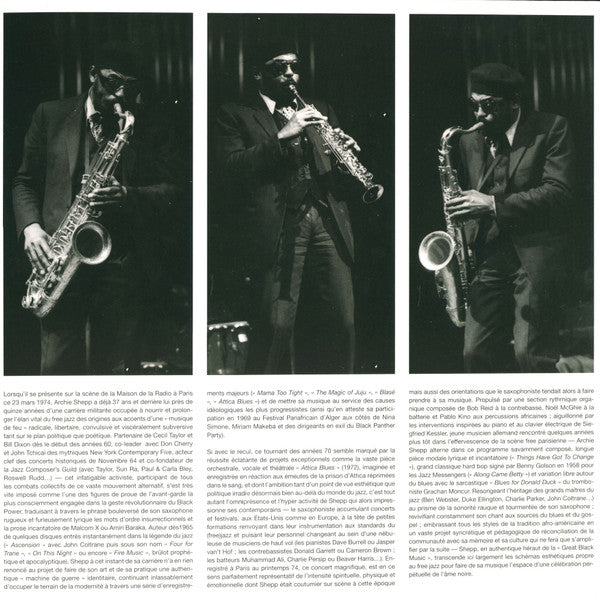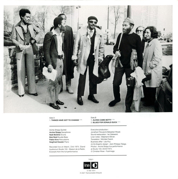 Recorded live on March, 23rd 1974, Grand Auditorium Studio 104 - Maison de la Radio. Excerpts from the full performance. Transversales Disques proudly presents Archie Shepp – Live In Paris 1974. A never released before ORTF recording performed live at Studio 104, Maison de la Radio Paris. First official release with the full permission and cooperation of the National Aduovisual Institute (INA). Courtesy of Archieball and Dawn of Freedom. Deluxe Edition, Classic Tip-On Gatefold Jacket Exclusive Liner Notes and Pictures Remastered from the original tapes Manufactured and distributed by The Pusher