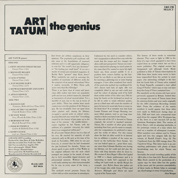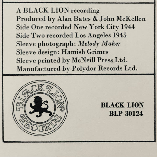 There are two odd things about this release: 1: No Side A or B indicator other than the runouts 2: No obvious country however, other than a different release, these labels are in exactly the same format as [ suggesting that this likely a UK release. This is further borne out by the Black Lion Records Cat# beginning 2406 and SELECT price code on [ which is also a UK release. MacNeill Press Limited is also a UK company Labels reference 1967 Cat#s BLP 30124 & 2460 158 on sleeve Cat# BLP 2460-158 on label Side One (A) recorded New York City 1944 Side Two (B) recorded Los Angeles 1945