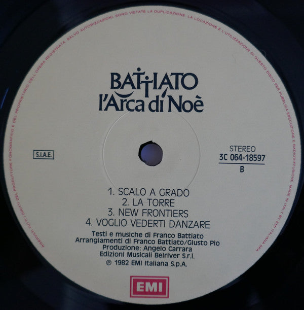 By the font used on labels title, probably a mid-80's reissue. Testi riprodotti per gentile concessione delle Edizioni Musicali Belriver Comes with printed inner sleeve with lyrics. ℗ 1982 EMI Italiana S.p.A. / © 1982 EMI Italiana S.p.A. Made in Italy by EMI Italiana S.p.A. On cover and labels " L'Arca Di Noè " On spine " L'Arca Di Noé "