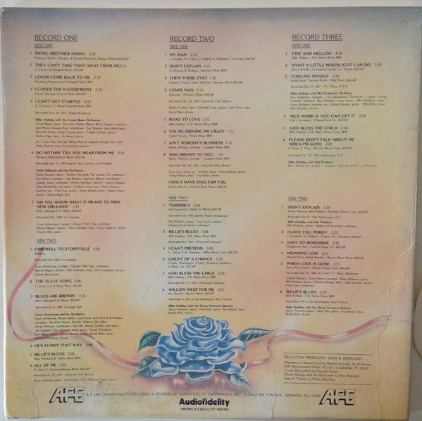 ©&℗ 1982 Audiofidelity Records, A Division of Audiofidelity Enterprises, Inc., 45 East Milton Ave., Rahway, N.J. 07065 Session date and location: # A1 to A5: June 30, 1937, Radio Broadcast. # A6: January 17, 1945, Esquire Jazz Concert, Los Angeles. # A7: October 1946, Los Angeles. # B1: October 1946, Los Angeles. # B2, B3: February 8, 1947, Carnegie Hall. # B4 to B6: October 29, 1951, Storyville Club, Boston. # C1 to C4: October 29, 1950 (probably 1951), Storyville Club, Boston. # C5 to C8: October 29, 1951, Storyville Club, Boston. # C9, D1: October 29, 1951, Storyville Club, Boston. # D2 to D6: 1957, Washington Jazz Festival. # E1 to E3: December 8, 1957, T.V. Show, N.Y.C. # E4 to F1: October 26, 1956, Washington D.C. # F2 to F5: Art Ford T.V. Show, Baltimore. # F6: 1957, Washington Jazz Festival.