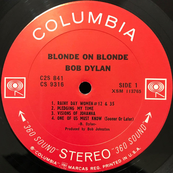 Issued on red Columbia 2-eye labels with "360 Sound" and "STEREO" in white lettering at the bottom, no "NONBREAKABLE" text to left of center hole, and "Walking Eye" logo to left of "Marcas Reg.," design introduced after 1967. Issued in first stereo gatefold jacket version, with interior picture of Claudia Cardinale, and another picture of an unknown woman whispering into Dylan's ear. "P" stamped in runouts denotes Columbia Records Pressing Plant, Pitman, pressing. Remainder of runouts mostly stamped. Track A4 title inside gatefold: "One of Us Must Know" Track B2 title on label: "Stuck Inside Of Mobile With The"; track B2 title inside gatefold: "Memphis Blues Again" Recorded at Columbia Recording Studios, Nashville, Tennessee.