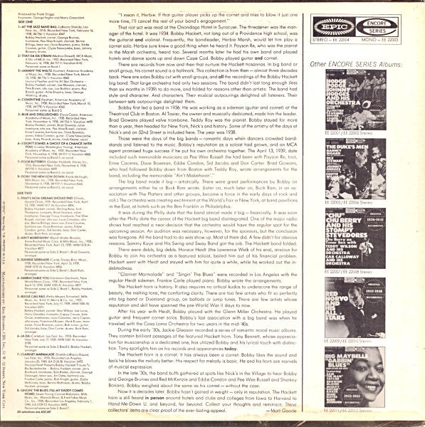 Original 1938-1940 Recordings Electronically Re-Channeled for Stereo Gatefold cover. Released in Mono as EE 22003 A product of Epic® Records • *T.M. of Columbia Broadcasting System, Inc. Manufactured by: Epic Records, CBS, Inc., 51 W. 52 Street, New York City. A1 - Leo Feist, Inc., 1918; Recorded New York, February 16, 1938, (M 756-1) Vocalion 4047. A2 - MCA Music, A Div. of MCA, Inc., 1922; Recorded New York, February 16, 1938, (M 757-1) Vocalion 4142. A3, A4 - American Academy of Music, Inc., 1938; Recorded New York, March 10, 1938, (M 776-1 & M 778-1) Vocalion 4062. A5 - American Academy of Music, Inc., 1938; Recorded New York, November 14, 1938, (M 916-1) Vocalion 4499. A6 - American Academy of Music, Inc., 1932; Recorded New York, November 4, 1938, (M 917-1) Vocalion 4565. A7 - Harms, Inc., 1916; Recorded New York, November 4, 1938, (M 918-1) Vocalion 4499. A8 - Mills Music, Inc., 1928; Recorded New York, November 4, 1938, (M 919-1) Vocalion 4565. B1 - Harold Orlob, 1939; Recorded New York, April 13, 1939, (WM 1017-A) Vocalion 4806. B2 - Anne-Rachel Music Corp. & Mills Music, Inc., 1928; Recorded New York, April 13, 1939, (WM 1018-A) Vocalion 4877. B3 - Dorsey Bros. Music, 1938; Recorded New York, April 13, 1939, (WM 1019-A) Vocalion 4806. B4 - World Music Corp., 1930; Recorded New York, April 13, 1939, (WM 1020-A), Vocalion 4877. B5 - Mills Music, Inc. & Ed H. Morris & Co, Inc., 1923; Recorded New York, July 17, 1939, (WM 1050-A) Vocalion 5375. B6 - Leo Feist, Inc., 1918; Recorded New York, July 17, 1939, (WM 1051-A) Vocalion 5198. B7 - Leo Feist, Inc., 1918; Recorded Los Angeles, January 25, 1940, (LA 2126-B) Vocalion 5493. B8 - Mills Music, Inc., Warock Music, & Fred Fisher Music Co., Inc., 1920; Recorded Los Angeles, February 1, 1940, (LA 2129-C) Vocalion 5493. B7 & B8: Horace Heidt Presents Bobby Hackett Tribute to Bix Beiderbecke. All selections are ASCAP.