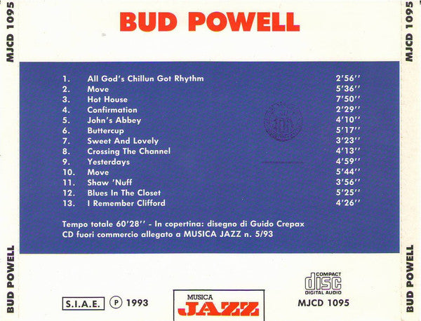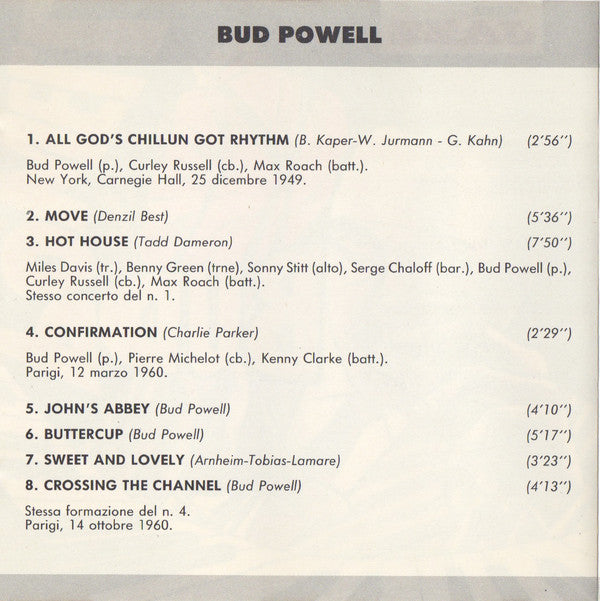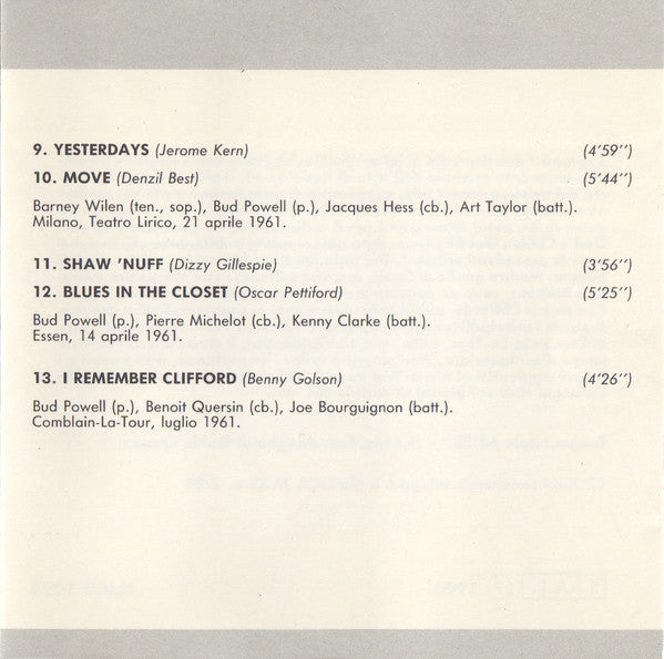 Ⓟ 1993 S.I.A.E. CD fuori commercio allegato a Musica Jazz n. 5/93. Tempo totale 60'28". [Out of commerce CD attached to Musica Jazz n. 5/93. Total time 60'28 ". track 1 recorded at Carnegie Hall, New York, December 25, 1949 track 2, 3 recorded at Carnegie Hall, New York, December 25, 1949 track 4 recorded in Paris, France, March 12, 1960 tracks 5 - 8 recorded in Paris, France, October 14, 1960 tracks 9, 10 recorded at Teatro Lirico, Milano, Italy, April 21, 1961 tracks 11, 12 recorded in Essen, Germany, April 14, 1961 track 13 recorded in Comblain-La-Tour, France, July, 1961