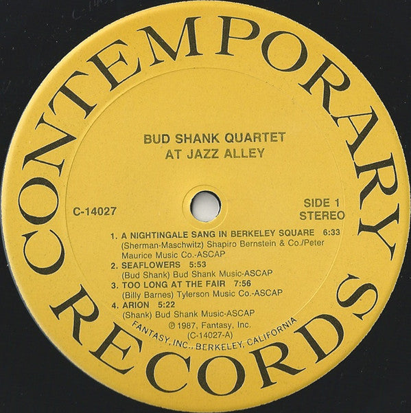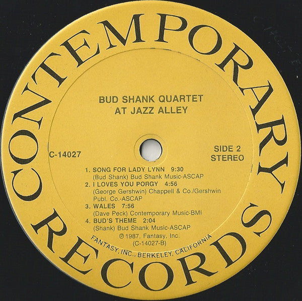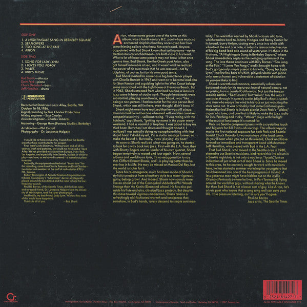 Richard Bock production. Recorded at Dimitriou's Jazz Alley, Seattle, WA October 16-18, 1986. Digital recording by Blue Charles Productions. Mastering-George Horn (Fantasy Studios, Berkeley). Management: David Keller, Modern Music, P.O. Box 19328A, Los Angeles, CA 90019 Contemporary Records, Tenth and Parker, Berkeley, CA 94710 ℗1987, Fantasy, Inc. © 1987, Fantasy Inc. Also available on cassette. A1 Shapiro Bernstein & Co./Peter Maurice Music Co.-ASCAP A2, A4, B1, B4 Bud Shank Music-ASCAP A3 Tylerson Music Co.-ASCAP B2 Chappell & Co./Gershwin Publ. Co.-ASCAP B3 Contemporary Music-BMI Printed in U.S.A. on spine. Inner sleeve printed in Canada.