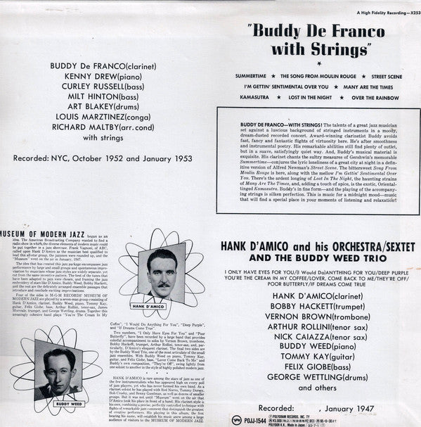 Ⓟ Polygram Records, Inc. TY Hank D'Amico: Recorded January 1947 Buddy DeFranco And Strings: Reorded October 1952 and January 1953 NYC Two different cat # on label A and label B Cat# variations on release (incl. legacy): Spine: x-253/mgm-49 Front cover: POJJ-1544 / x253 Rear cover: x253 / POJJ-1544 (sticker) Disc labels: x-253 (side A) & MGM-49 (side B) POJJ-1544-1 & -2