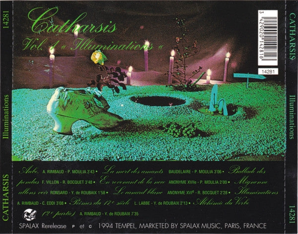 Studios: Davout and E.T.A. Rerelease p et c 1994 Tempel, marketed by Spalax Music, Paris, France [on cover Reissue ℗ + © 1994 Spalax Music, Paris France [on CD Catalogue number variations are: 14281 on cover art, CD 14281 on CD. Packaged in a standard jewel case with 4-page booklet. Spalax logo on cover, Spalax Music logo on CD.