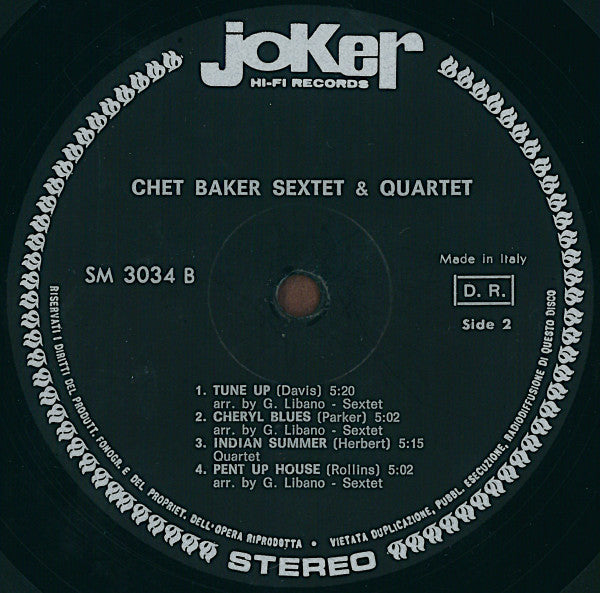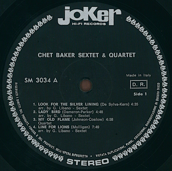 Variant back cover (different advertisements) and slightly different labels than [r2593233 Recorded in Milan September 25 (A2), September 26 (B1, B2, A4), October 6 (A1, A3, B3, B4) 1959. Recording dates and personell from the Chet Baker Discography at Track A4 is misspelled "Line For Lions" on back of cover and label side A Boxed D.R. Rights note (Diritti Riservati) on labels, this was used on Italian records c. 1968-69, before the introduction of the SIAE rights society in 1970, cf. Made in Italy.