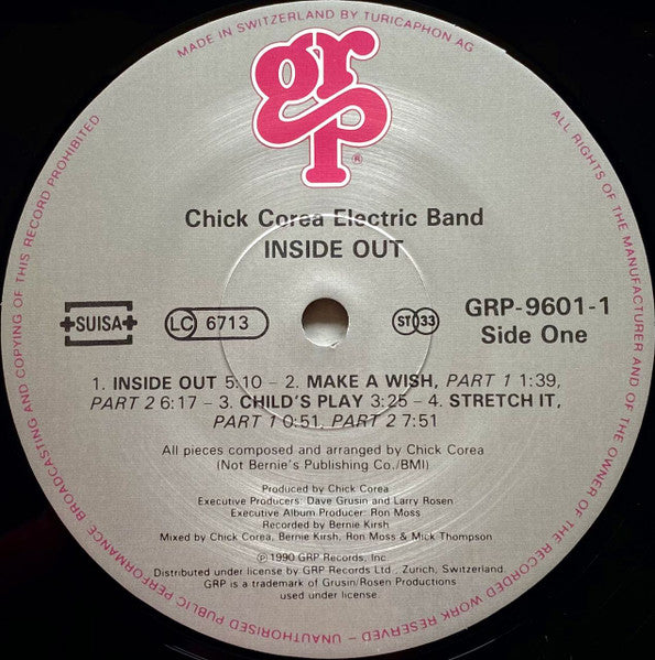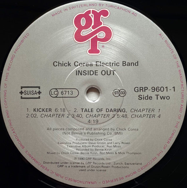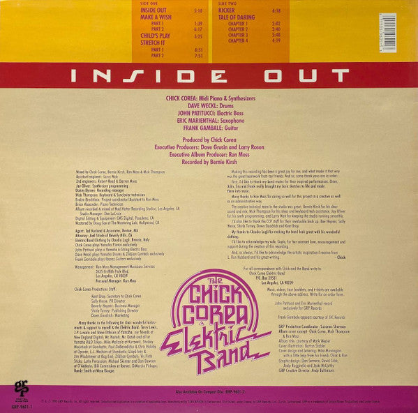 "Chick Corea Elektric Band" appears on sleeve front, spine and labels. "The Chick Corea Elektric Band" appears in the group logo on back sleeve. Some copies come with a sticker: 808 834 998