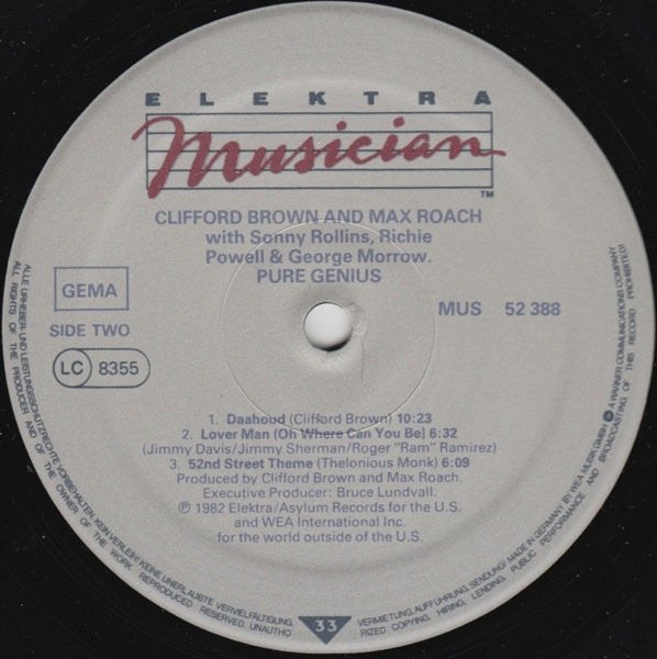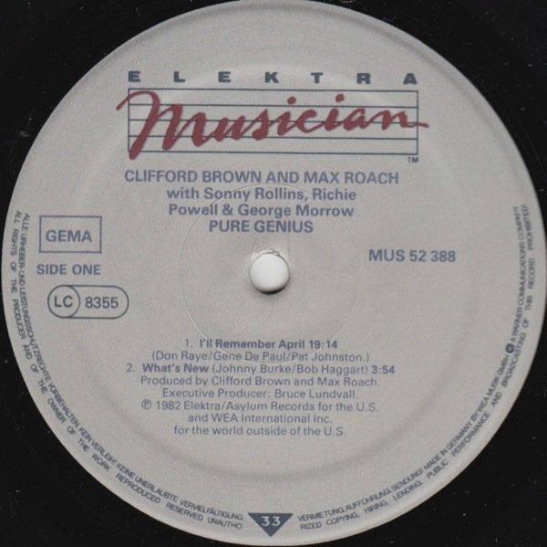 Previously unreleased performances from the private collection of Mrs. Clifford Brown. Recorded live in 1956. Distributors: Belgique/België: Distributed by WEA Records S.A./N.V. Deutschland: Vertrieb durch WEA Musik GmbH England: Distributed by WEA Records Ltd. France: Distribué par WEA/Filipacchi Music, Paris Italia: Distributed by WEA Italiana S.P.A. Nederland: Distributed by WEA Records B.V. Österreich: Vertrieb durch WEA Music Ges.m.b.H Sverige: Distributed by WEA Metronome Records AB Manufactured in Germany by Record Service GmbH, Alsdorf ℗ and © 1982 Elektra/Asylum Records for the United States and WEA International Inc. for the world outside the United States.