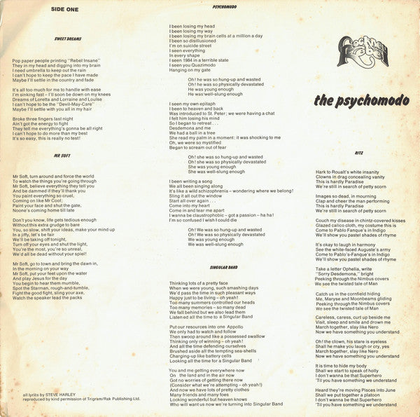 Lyrics insert. Matte sleeve. Side A runout ends in a continuous locked groove. [Labels ℗ 1974 EMI Records Limited Made in Gt. Britain [Back cover File under POPULAR ℗ 1974 EMI Records Ltd 7406 Made and printed in England by Garrod & Lofthouse Ltd Runouts are stamped, last additional letters / ciffer tilted 90º