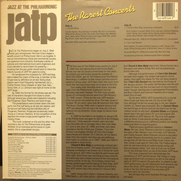 Side A recorded late Sept. 1953, exact date & location unknown B1 recorded April 23, 1946, at the Embassy Auditorium, Los Angeles B2 recorded May 27, 1946, at Carnegie Hall, NYC