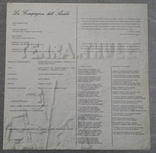 Laminated sleeve. Printed inner sleeve including lyrics. «Terra di Thule, ovvero l'isola trovata. Sogni vissuti e tracce di vita. "Come eravamo, come siamo", appunti di viaggio sul sentiero del "come saremo". Un po' di presunzione e un po' di umiltà, un po' di ironia e (speriamo) un po' di poesia, po' di professionalità e un po' di dilett(o)antismo: una prova.» [a3010852