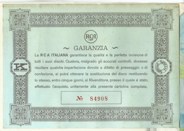 Promotional printed inner sleeves lined with cover images of other releases by RCA Italiana S.p.A. polyvinyl liner. Some copies released with sticker "RCA Italiana S.p.A. warranty" on back cover. "Lennon" on the back cover is printed incorrectly as "Lenno" and then manually corrected.