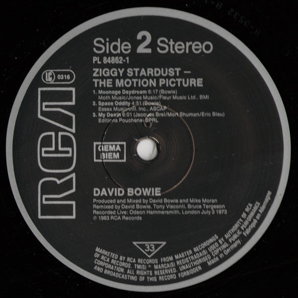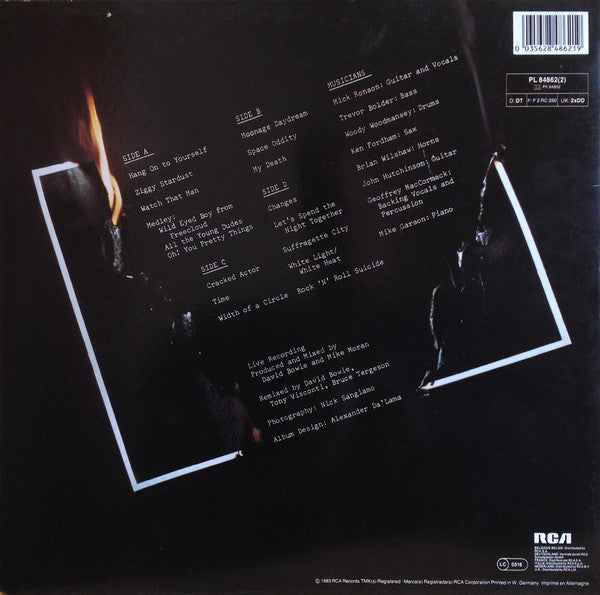 [Back BELGIQUE/BELGIE: Distributed by RCA S.A. FRANCE: Distribué par RCA S.A. ITALIA: Distributed by RCA S.p.A. NEDERLAND: Distributed by RCA B.V. U.K.: Distributed by RCA Ltd. © 1983 RCA Records TMK(s) Registered ∙ Marca(s) RCA Corporation Printed in W. Germany. Imprime en Allemagne [Label side 1 to 4 Stereo Recorded Live: Odeon Hammersmith, London July 3 1973 ℗ 1983 RCA Records Made in Germany Additional information: Originally intended to have been released in February 1974 as a double LP ("Bowie-ing Out") but the plan was abandoned. Finally released in October 1983. Subsequently re-released in a remixed form as a 30th anniversary edition in 2003. B3 is only credited to Jacques Brel. However, words and music are by Jacques Brel and it is translated to English by Mort Shuman and Eric Blau. Different arrangement of song titles on Side 1. Some titles below the publishing box. See : [r2198791 for version with all titles above. Runouts are stamped.