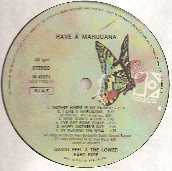 "Recorded live on the streets of New York" Stereo Butterfly Elektra center labels. (1970s) Manufactured & Distributed in Italy by WEA Italiana S p A Milano