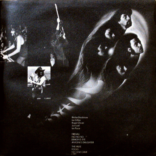 ‘Gramophone Co.’ variant labels, including e.g. – different text positioning from [r=469215 – different fonts from [r=5811241 and [r=8233684 – different A-side label from [r=10342134 First edition with a darker textured gatefold sleeve depicting five b&w live photos inside, while later editions are paler and smooth. Rough labels with ‘The Gramophone Co. Ltd.’ at the beginning of the rim text. Initial quantities came with a lyrics insert printed in purple on both sides and in a generic polylined EMI inner sleeve depicting other artists' current releases. The second catalogue number appears on the rear sleeve. Album devised and produced by Deep Purple for Edwards/Coletta Productions. Made and printed in Great Britain. Runouts are stamped except for PEK which is etched.