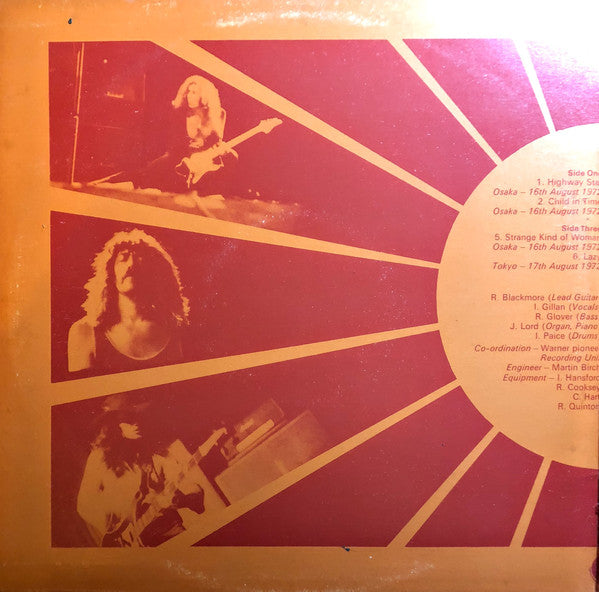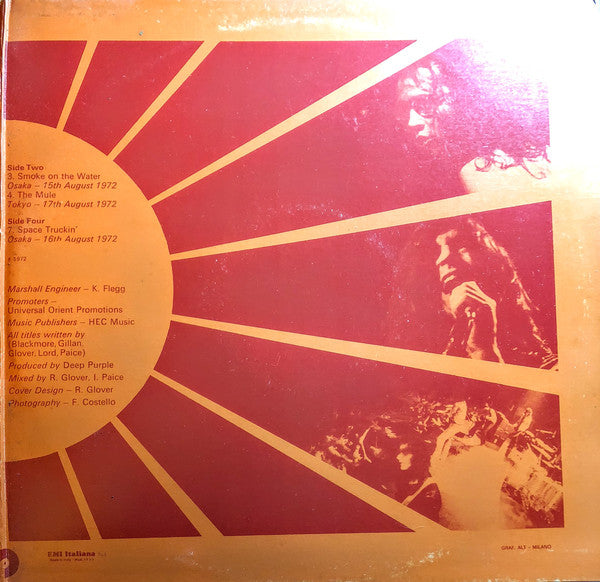 Made in Italy by EMI Italiana Spa Gatefold sleeve with "LIVE" printed on front, tracks on back listed as 1 to 7. Title on labels is actually "Deep Purple Made In Japan", small SIAE print (about 8mm.) Four sides marked as A, B, A, B. In this version appears in the Gatefold the inscription in the lower right corner "GRAF ALT - MILANO" and the Credit (Blackmore-Gilian-Glover-Lord-Paice) do not have space between them. Recorded live in Japan A1: Osaka - 16th August 1972 A2: Osaka - 16th August 1972 B1: Osaka - 15th August 1972 B2: Tokyo - 17th August 1972 C1: Osaka - 16th August 1972 C2: Tokyo - 17th August 1972 D: Osaka - 16th August 1972