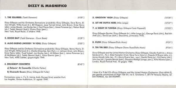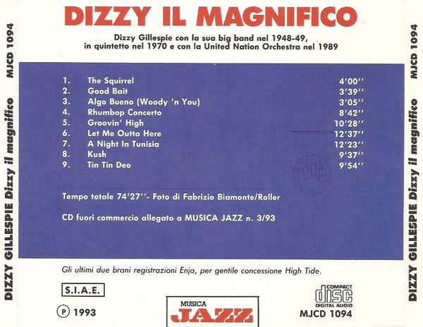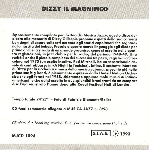 Ⓟ 1993 S.I.A.E. CD fuori commercio allegato a Musica Jazz n. 3/93. [Out of commerce CD attached to Musica Jazz n. 3/93. Tempo totale 74'27". Gli ultimi due brani registrazioni Enja, per gentile concessione High Tide. Dizzy Gillespie con la sua big band nel 1948-49 in quintetto nel 1970 e con la United Nation Orchestra nel 1989. [The last two tracks Enja recordings, courtesy of High Tide. Dizzy Gillespie with his big band in 1948-49 as a quintet in 1970 and with the United Nation Orchestra in 1989. SESSIONS DATE AND LOCATION: # 1: Royal Roost, New York, October 5, 1948. # 2, 3: AFRS Jubilee, New York, June-July 1949. # 4.a, 4.b: Shrine Auditorium, Los Angeles, August 31, 1949. # 5 to 7: Stockholm, Spring 1970. # 8, 9: Royal Festival Hall, London, June 10, 1989.