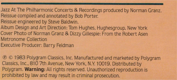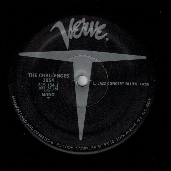 (P) & (C) 1983 Polygram Classics, Inv. New York Recorded in 1954 All material priviously released second cat# on spine PAN/Title variations: - Spine: Jazz At The Philharmonic ● The Challenges - Front cover: Jazz At The Philharmonic The Challenges Dizzy Gillespie ■ Roy Eldridge ■ Ben Webster - Rear cover: Jazz At The Philharmonic jatp The Challenges - Disc labels: The Challenges 1954 Rim text disc labels: manufactured and markerted by Polydor Incorporated 810 Seventh Avenue N.Y., N.Y. 10019