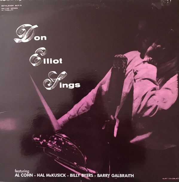 Maroon label with silver print in circular pattern and "laurel leaf" logo at top. Artist name spelled "Don Elliot" on front cover and labels, "Don Elliott" on back cover.