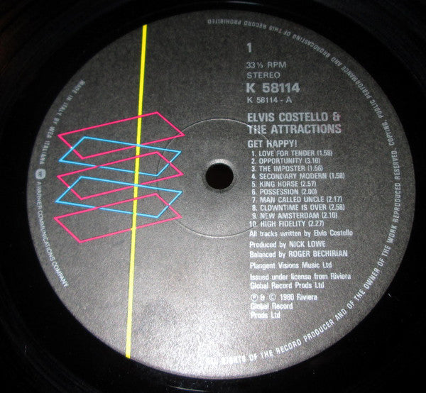 Recorded in Holland Photography VAT 239 7568 14 Artwork VAT 245 4945 42 Issued under license from Riviera Global Record Productions Limited Made and Distributed in Italy by WEA Italiana S.P.A Milano Printed by - La Grafica Cremonese - Italy Similar to other releases, the listings on the back cover for "side one" and "side two" do not correspond with Side's A and B. Features a message from producer Nick Lowe beneath the "side two" tracklisting. " Hi! You'll have noticed that there are ten(?) tracks on each side of this, Elvis new L P making it a real 'long player'! Elvis and I talked long and hard about the wisdom of taking tnis unusual step and are proud that we can now reassure hi-fi enthusiasts and/or people who never bought a record before 1967 that with the inclusion of this extra music time they will find no loss of sound quality due to 'groove cramming' as the record nears the end of each face (i.e. the hole in the middle) Now get happy Your friend, (sig) Nick Lowe Producer" Colored sleeve with "Big Man, Happy Man, etc." art