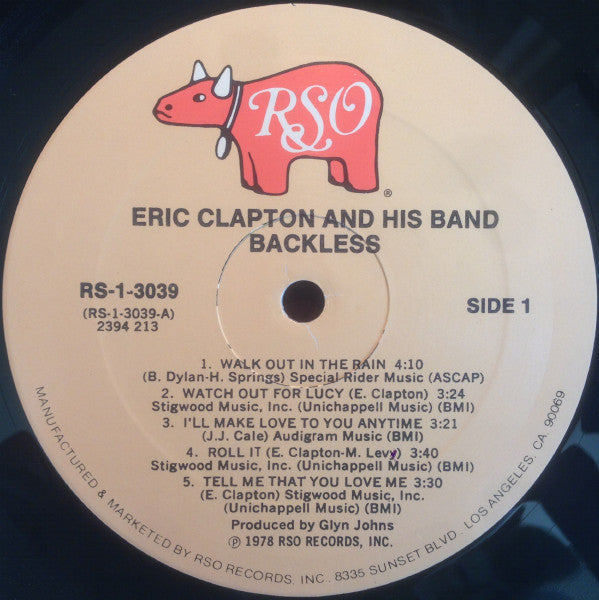 "PRCW" etched in runouts denotes PRC Recording Company, Compton, CA, pressing. Similar to [r=10062528 with identical labels, but cover text is embossed with gold inlay. Issued in textured gatefold jacket. © ℗ 1978 RSO Records, Inc. Track publishers: A1, B1: Special Rider Music (ASCAP) A2, A4, A5, B2, B4: Stigwood Music, Inc. (Unichappell Music) (BMI) A3: Audigram Music (BMI) B3: Narwhal Music (BMI) (Skyhill Pub., Co., Inc., Admin.) B5: Bibo Music Publishers (ASCAP) Artist on labels: "Eric Clapton And His Band"