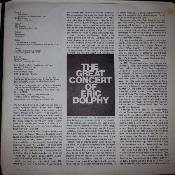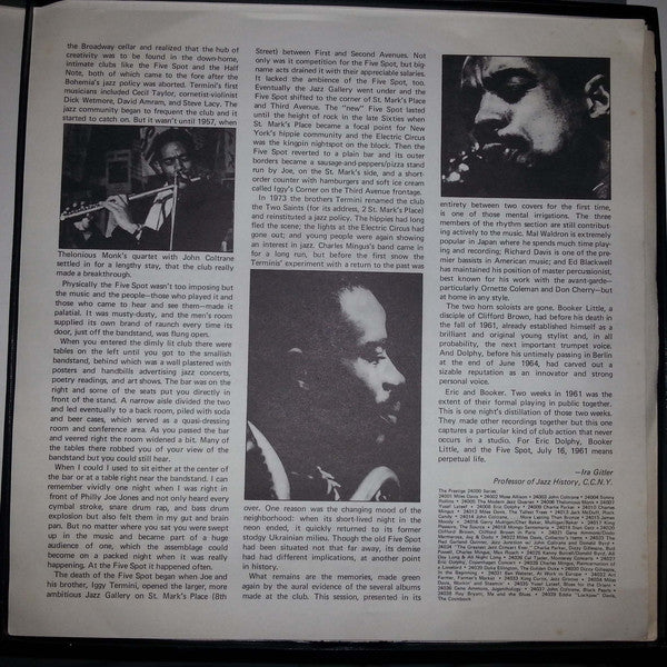 Recorded: July 16, 1961; Re-mastered: 1974. Sides 1 and 2 originally issued as "Live At the Five Spot, Vol.1" (Prestige/New Jazz 8260); sides 3 and 4 as "Live At the Five Spot, Vol.2" (P/NJ-8288); sides 5 and 6 as "The Eric Dolphy Memorial Album" (P-7334). Includes an insert.