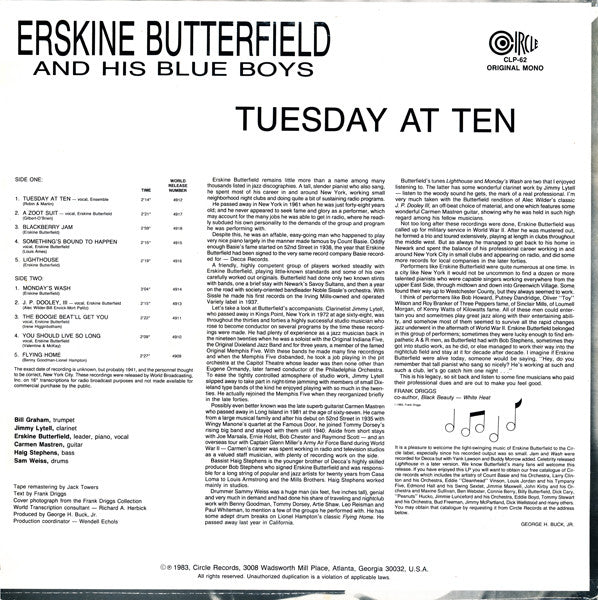 The exact date of recording is unknown, but probably 1941, and the personnel thought to be correct, New York City. These recordings were released by World Broadcasting, Inc. on 16" transcriptions for radio broadcast purposes and not made available for commercial purchase by the public. ©℗ 1983, Circle Records, 3008 Wadsworth Mill Place, Atlanta, Georgia 30032, U.S.A.