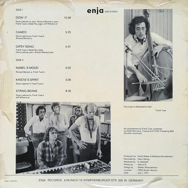 All compositions by Frank Tusa. Recorded at TRIXI-Studio, Munich, Germany, July 1, 1975. Published by ENJA (Germany, France) and TUSE Publishing BMI (all other countries). Made in w-germany. ENJA RECORDS 8 MUNICH 19, NUMPHENBURGER STR. 209. W.-GERMANY.