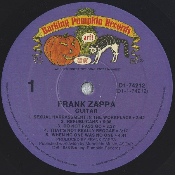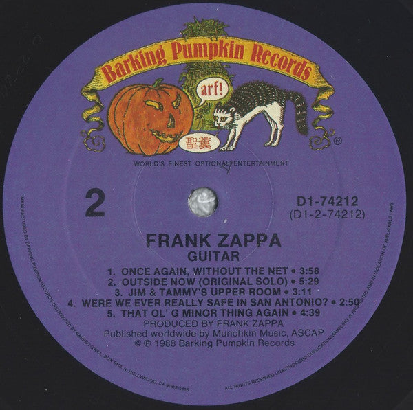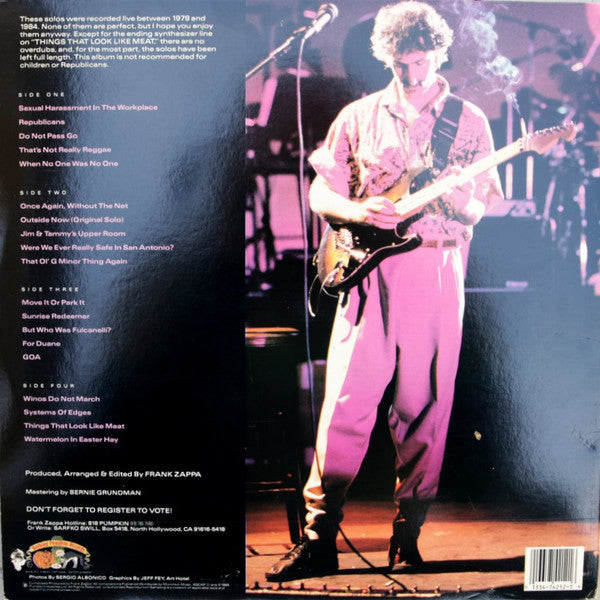 A1 recorded December 1981, San Diego, California A2 recorded November 1984, Philadelphia, Pennsylvania A3 recorded June 1982, London, England A4 recorded September 1984, London, England A5, C3 recorded June 1982, Cologne, West Germany B1 recorded November 1984, Portland, Oregon B2, D2 recorded February 1979, Wiesbaden, West Germany B3 recorded June 1982, Bordeaux, France B4 recorded November 1984, San Antonio, Texas B5 recorded June 1982, Zurich, Switzerland C1 recorded June 1982, Frankfurt, West Germany C2, D1 recorded November 1984, Fort Lauderdale, Florida C4 recorded November 1984, Atlanta, Georgia C5 recorded November 1984, Chicago, Illinois D3 recorded December 1981, Salt Lake City, Utah D4 recorded July 1984, Jones Beach, New York "These solos were recorded live between 1979 and 1984. None of them are perfect, but I hope you enjoy them anyway. Except from the ending synthesizer line on 'THINGS THAT LOOK LIKE MEAT', there are no overdubs, and, for the most part, the solos have been left full length. This album is not recommended for children or Republicans."