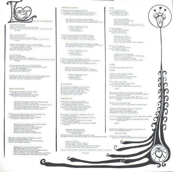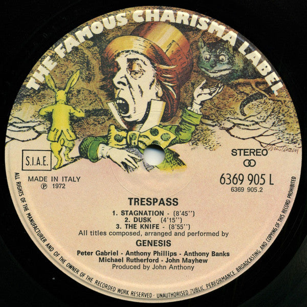 Sleeve laminated on front + insert with lyrics Typo on spine: Trespass ● Genesi Catalog number: 6369 905 A (on back cover and spine) 6369 905 L (on labels) On labels: Made in Italy ℗ 1972 On runout: Laquers cutting date on run-out area: 25.01.72