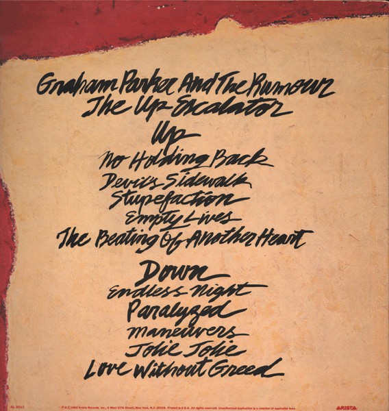 There's no title or artist on the cover so it's different than [r2088969. "T1" in runouts denotes a [l403953 pressing. (C) 1980 Arista Records Inc. "On the up escalator going down all the cracks"