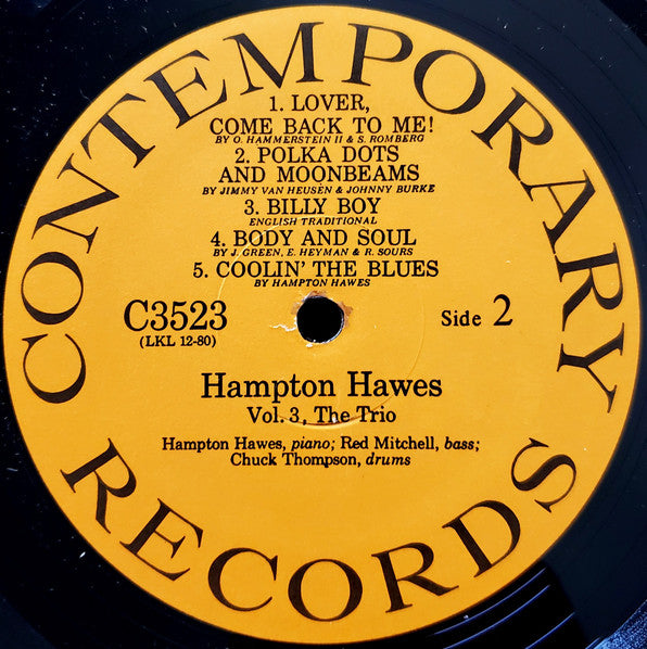 1980s reissue with etched LKL runouts. Inscribed SLM indicates plating by Sheffield Lab Matrix. SLM delta codes △1146 and △1147 can safely date this release to 1982 by comparing against other SLM-plated releases. Recorded on January 25, 1956 at Contemporary's Studio, Los Angeles, California. Yellow label, black print.