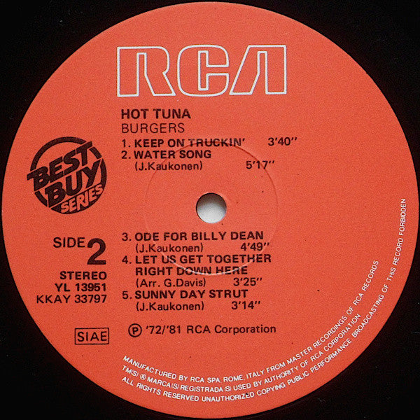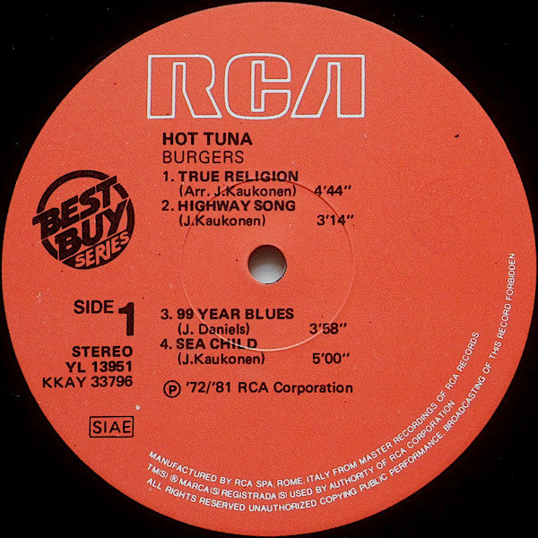 [Sleeve The sleeve is identical to this US reissue except for a few details (series logo, catalog number, no mention of the older catalog number on back). Therefore the following company credit should be considered an 'artwork leftover': Manufactured and distributed by RCA Records, New York, N.Y. [Labels ℗ '72/'81 RCA Corporation. Manufactured by RCA SpA, Rome, Italy from master recordings of RCA Records. Recorded at Wally Heider Studios, San Francisco. A Fishobaby production. A1 to A4, B2, B3, B5 : BMI B1, B4 : ASCAP