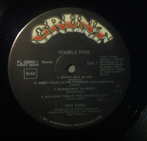 Gatefold sleeve. "Double Dose" (an affliction brilliantly played by Hot Tuna) Recorded live by Wally Heider Recording at Theatre 1839, San Francisco. Additional recording at Wally Heider Studios.