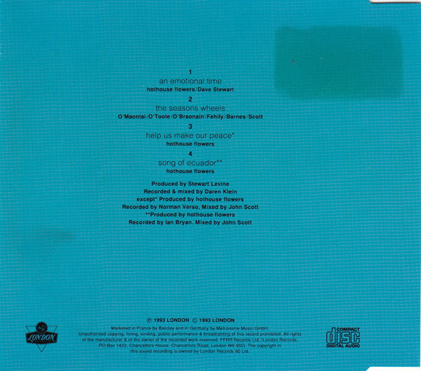 Inlay: ℗ 1993 London © 1993 London Marketed in France by Barclay and in Germany by Metronome Music GmbH. The copyright in this sound recording is owned by London Records 90 Ltd. Disc: ℗ 1993 London © 1993 London _ Catalog number: 857019.2 on spine & flap Int. 857019.2 on disc Track durations are not printed on the release.