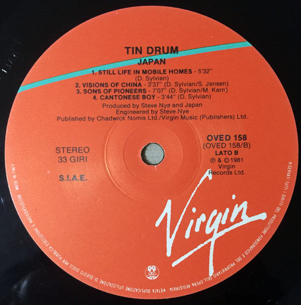 ℗ + © 1981 Virgin Records Ltd. Made in Italy Published by Chadwick Nomis Ltd. / Virgin Music (Publishers) Ltd. Italian reissue of the LP that was originally reissued in 1986, white/grey Virgin logo, catalogue # OVED 158. This reissued edition was manufactured with green/red Virgin labels. Sleeve is marked: Printed by [l360422 Inzago.