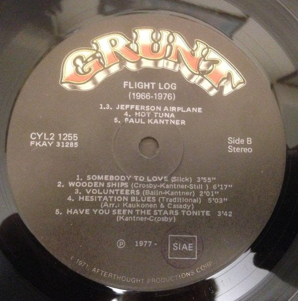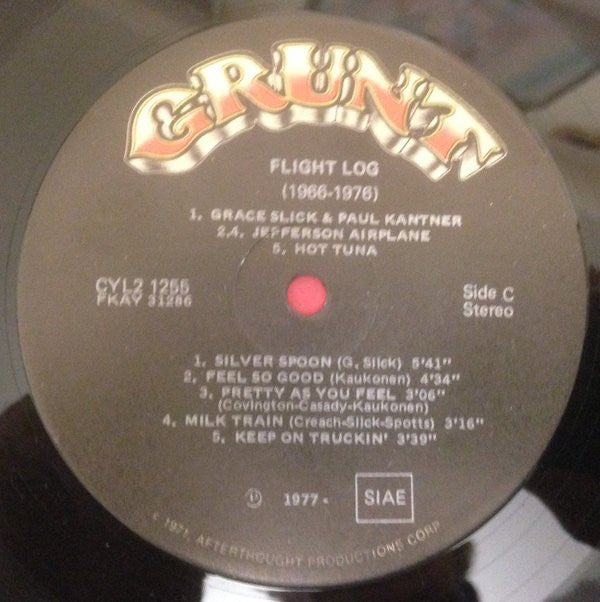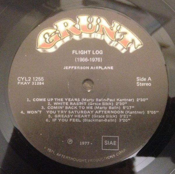 Collection of tracks from 1966 to 1976 Release comes with large booklet. Pictures of Band and Thanks to members. Information from backcover: Public performance clearance - BMI, except ASCAP © 1977 Grunt Records • Manufactured and Distributed by RCA Records, New York, N.Y. • Printed in U.S.A. A1: Jefferson Airplane Takes Off 1966 A2, A3: Surrealistic Pillow 1967 A4: After Bathing At Baxter's 1967 A5, A6: Crown Of Creation 1968 B1: Bless It's Pointed Little Head 1969 B2, B3: Volunteers 1969 B4: Hot Tune 1970 B5: Blow's Against The Empire 1970 C1: Sunfighter 1971 C2, C3: Bark 1971 C4: Long John Silver 1972 C5: Burgers 1972 D1: Manhole 1973 D2: Baron Von Tollboth & The Chrome Nun 1973 D3: Quah 1974 D4: Dragon Fly 1974 D5: Unreleased Live Performance 1976 [Runout, variant 2 Everything behind - is etched, the rest is stamped. FKAY see [l709538