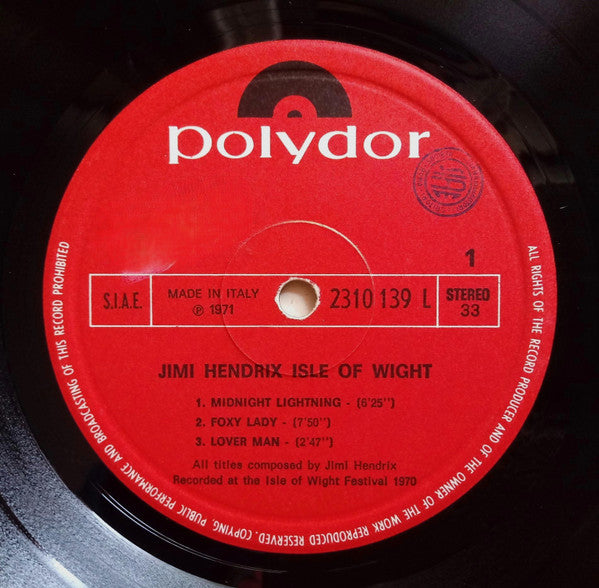 1st italian 1971 edition, laminated on front cover. Labels: no 'D.R.' under S.I.A.E.on both sides; unique rim text (fonts and wording). Runouts: the side indicators '1' and '2' are placed outside the matrix strip. Same catalog number '2310 139 L' on labels, back cover and spine. 1st type SIAE stamp on label. Recorded at the Isle Of Wight Festival 1970 Runouts are stamped.