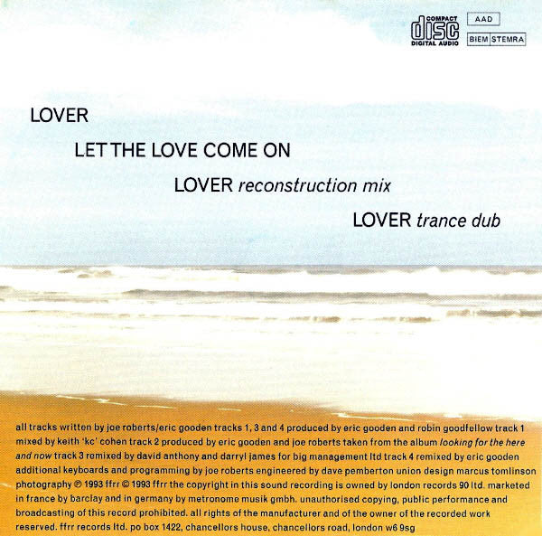 "Lover" and "Let The Love Come On" taken from the album "Looking For The Here And Now". Track 3 remixed for Big Management Ltd. ℗ 1993 FFRR © 1993 FFRR The copyright in this sound recording is owned by London Records 90 Ltd. Marketed in France by Barclay and in Germany by Metronome Musik GmbH. fcd 220 int 857 321-2 Durations do not appear on the release.