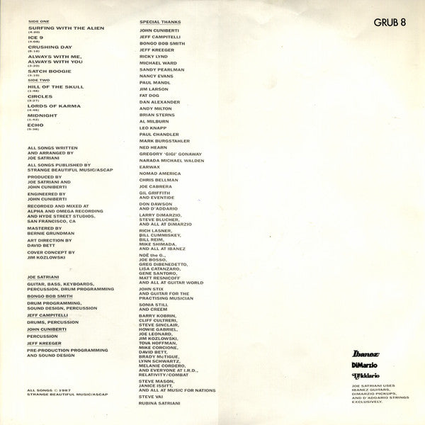 Recorded and mixed at Alpha and Omega Recording and Hyde Street Studios, San Francisco, CA. ℗ 1987 Relativity Records Inc. © 1987 Strange Beautiful Music/Ascap Issued under licence from Relativity, Relativity Records Inc TM & © 1987 Marvel Entertainment Group, Inc. All rights reserved Joe Satriani uses Ibanez Guitars, DiMarzio Pickups and D'Addario Strings exclusively. Made in England