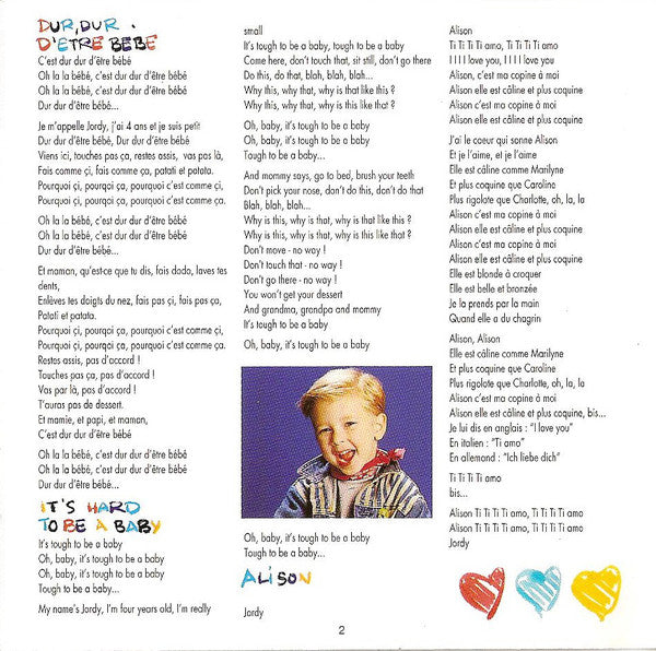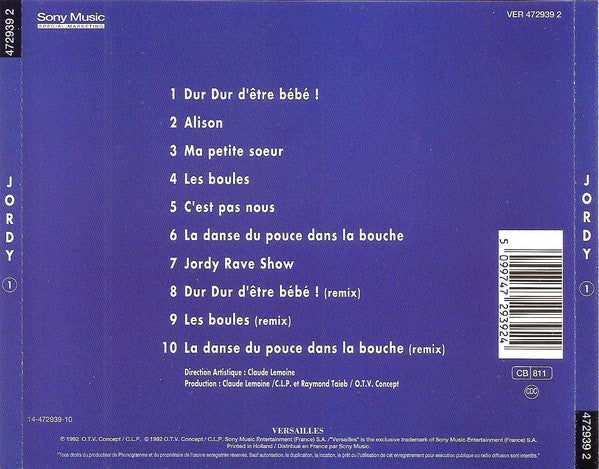 Produced for C.L.P. / O.T.V. Concept. Recording Studio: Ile Belle Studio, Meulan. Thank You's: CP Cash and all their staff. Alain Alexandre. Alison Bajet (along with her mom and dad). Lionel Borée. Frédéric Taïeb. The DJ's, M40 and all the independant stations. A big wink (thank you) to M.C.V. "C'est Pas Nous (That's Not For Us)" interpreted by Jordy with help of Myriam Le Dig while zapping channels on Oct. 25, 1992. Some editions double stickered: "Pub TV 11-052134-40" and "Dur Dur D'etre Bebe! 14-472186-10". DADC AUSTRIA on inner ring CD.
