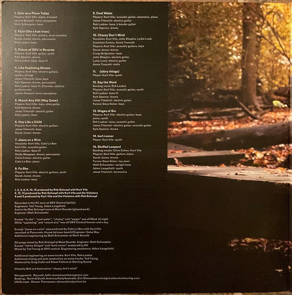 Packaged in a gatefold sleeve. Each LP is housed in a custom inner sleeve. Rear sticker: Made In Czech Republic A Verve Records release. ℗ © 2022 overnite kv incorporated, under exclusive license to Verve Label Group, a division of UMG Recordings, Inc. 1755 Broadway, New York, NY 10019. Distributed by UMG Commercial Services. Recorded in the KV zone at OKV Central (philly) And in the Rob Schnapf zone at Mant Studios (glassel park) Except "fo sho", "cool water", "chazzy" and "wages"| was all Mant all night. While "exploding" and "mount airy" was all OKV Central forever and a day. Except "jesus on a wire" [... recorded at Panoramic House (stinson beach) Additional engineering [... at Mant Sounds All songs mixed [... at Mant Sounds. Except "(shiny things)" and "(kurt runner)" [... Mixed [... at OKV central. All songs by Kurt Vile (BMI) Except "wages of sin" by Bruce Springsteen (UMPG)