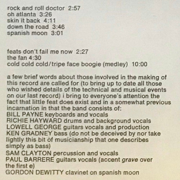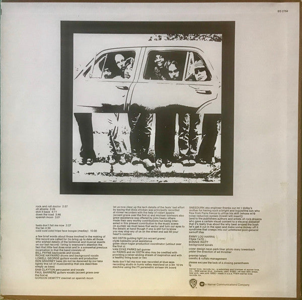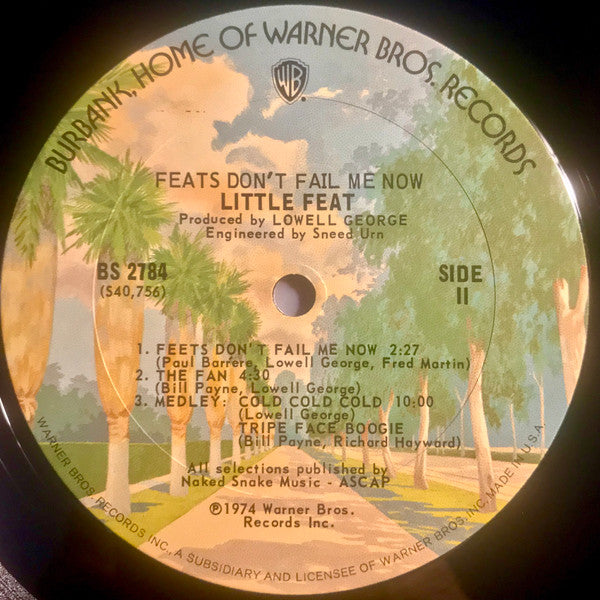 Label shows B1 misspelled "Feets" instead of Feats correctly spelled on rear sleeve track list. Back cover has revised track list in correct running order, with run times. Label circa 1974 with "Burbank" & palm trees, but no "Warner Communications" or "W" logo yet. Faint "P"stamped in the runouts (most visible on Side B) indicates pressing from [l447694