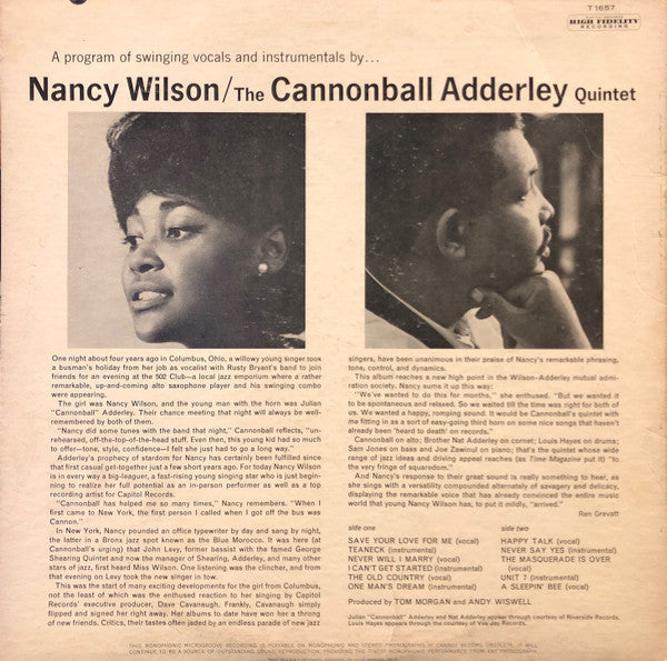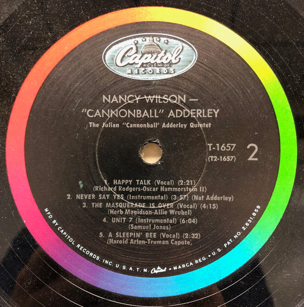 Issued on Capitol rainbow/colorband labels with logo at top, design introduced circa 1962. Label variation of [r=2366204, with larger side indicators. "Anvil" symbol ("⌂") stamped in runouts denotes Capitol Records Pressing Plant, Scranton, pressing. Remainder of runouts stamped. Back cover variation, with no fabrication code at bottom right next to text block. Catalog number T 1657 on jacket; T-1657 on labels. Artist on back cover: Nancy Wilson / The Cannonball Adderley Quintet Artists on labels: Nancy Wilson — "Cannonball" Adderley The Julian "Cannonball" Adderley Quintet On spine: Nancy Wilson / Cannonball Adderley Tracks A1, A3, A5, B1, B3 and B5: Vocal Tracks A2, A4, A6, B2 and B4: Instrumental Julian "Cannonball" Adderley and Nat Adderley appear through courtesy of Riverside Records. Louis Hayes appears through the courtesy of Vee Jay Records.