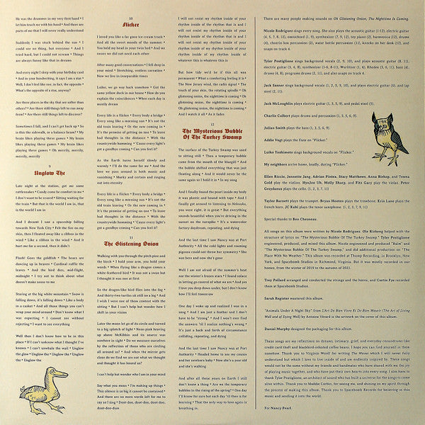 Special thanks to Ben Chesneau. All songs on this album were written by Nicole Rodriguez. Ole Kirkeng helped with the structure of lyrics on "The Mysterious Bubble Of The Turkey Swamp." Nicole engineered and produced "Balm" and "The Mysterious Bubble Of The Turkey Swamp," and did additional production on "The Place With No Weather." This album was recorded at Thump Recording, in Brooklyn, New York, and Spacebomb Studios in Richmond, Virginia. But it was mostly recorded in our homes. from the winter of 2019 to the autumn of 2021. Trey Pollard arranged and conducted the strings and the horns, and Curtis Fye recorded them at Spacebomb Studios. "Animals Under A Night Sky" from L'Art De Bien Vivre Et De Bien Mourir (The Art of Living Well and of Dying Well) by Antoine Verard is the artwork on the cover of this album.