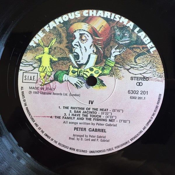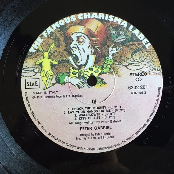 Printed innersleeve with lyrics. Recorded: at home (the first two weeks with Mobile One) and mixed down the road at Crescent Studios, Bath Remix: Shock The Monkey , Sarm Studios, engineer Julian Mendelsohn with the help of Danny Heaps Digital editing: Advision Studios with thanks to Mike King Digital Mixing facilities: (Sony PCM 1610 system) supplied by Digital Audio Systems Fairlight CMI recording, programming and development: Stephen Paine of Syco Systems, Gabriel, Lord and Fast Digital Delays and reverberation: AMS with thanks to Stuart Nevison and Mark Crabtree Management: Gailforce with special thanks to Gail Colson and Norma Bishop Thanks to: Jill, Stephanie, Tattie, Eda, Glenn and Gaynor The album is titled "IV" on the labels.