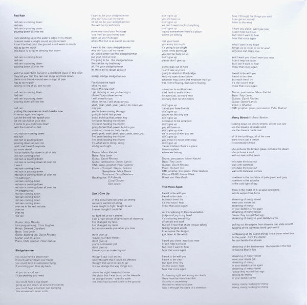 The album has been Half-Speed Remastered and cut to lacquers at 45RPM, across 2 x heavyweight LPs, to deliver maximum dynamic range in the sound. The vinyl cutting and mastering was overseen by Peter’s main sound engineer, Richard 'Dickie' Chappell. Gatefold sleeves utilise imagery from the original LP inner bags and all images are newly re-scanned. The album also contains a time-limited download card with a choice of digital download (Hi-Res 24bit/96k or 16bit/44.1k). Each disc is housed in a plain white poly lined inner sleeve. The gatefold inner spread has lyrics and credits. C1 is titled 'Mercy Street for Anne Sexton' The first Catalog number appears back cover top right, spine, inner gatefold spread and labels. The second appears back cover lower left and on the sticker. From back cover: ℗ 2016 Peter Gabriel Ltd © 2016 Peter Gabriel Ltd Manufactured in the EU From inner gatefold spread: Originally mastered by Ian Cooper at The Town House, London Vinyl cut by Mark Colton at Alchemy Mastering Mastered by Tony Cousins at Metropolis All songs published by Real World Music Ltd/EMI Music Publishing Ltd except 'This Is The Picture - excellent birds' published by Difficult Music/Universal Music Publishing MGB Ltd/Real World Music Ltd/EMI Music Publishing Ltd All tracks recorded and mixed at Real Worls Studios, England except for 'Mercy Street'; percussion recorded in Polygram Studios, Rio de Janeiro, engineered by Ary Carvalhaes and Jairo Gualberto, studio organisation by Luigi Hoffer, session supervision by Renato Costa and Graciela Silberberg. New York overdubs recorded at The Power Station, engineered by Bruce Lampcov, assisted by Steve Boyer, session supervision by Charlene Colon For additional work on tracks not included, thanks to Larry Fast, Jimmy Bralower, Paul Higgins and The House of Music Runouts are etched except '14991 1X 00884108004340' is stamped, where 1X is 1A, 1B, 1C or 1D depending on the side.