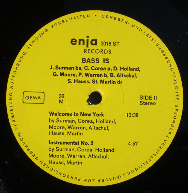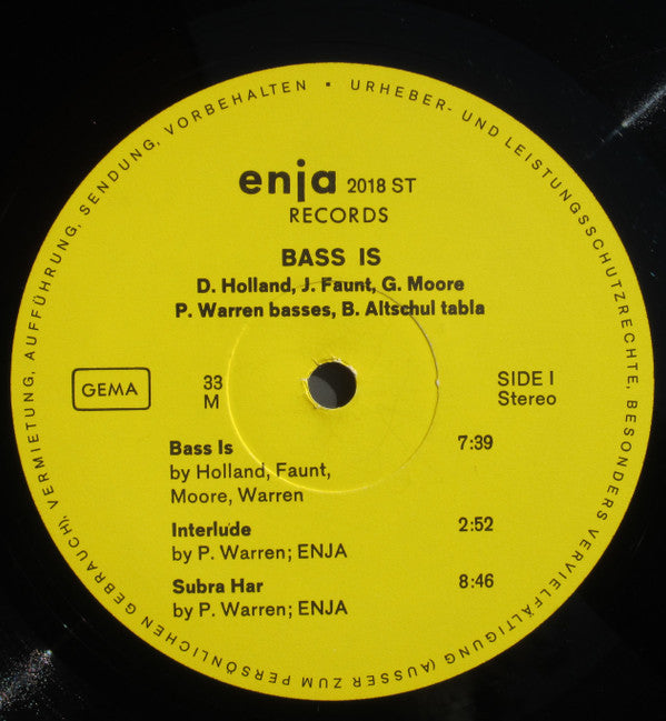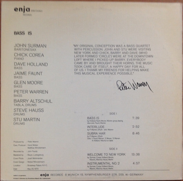 Recorded May 25, 1970, at Broadway Palace, NYC. Landmark album under the direction of Peter Warren. First Pressing on Enja, Second on Italian PDU (A5068). Liner Notes: "My original conception was a bass quartet with percussion. John and Stu were visiting New York and Chick, Barry and Dave (who later formed Circle) were at the downtown loft where I picked up Barry. Everybody came by and brought their horns. The music took care of itself, a happy day for all of us. I thank my friends for helping make this experience possible" - Peter Warren.